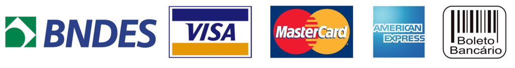 Cartão BNDES, cartões de crédito Visa, Master Card e American Express, Boleto Bancário e à vista com desconto.